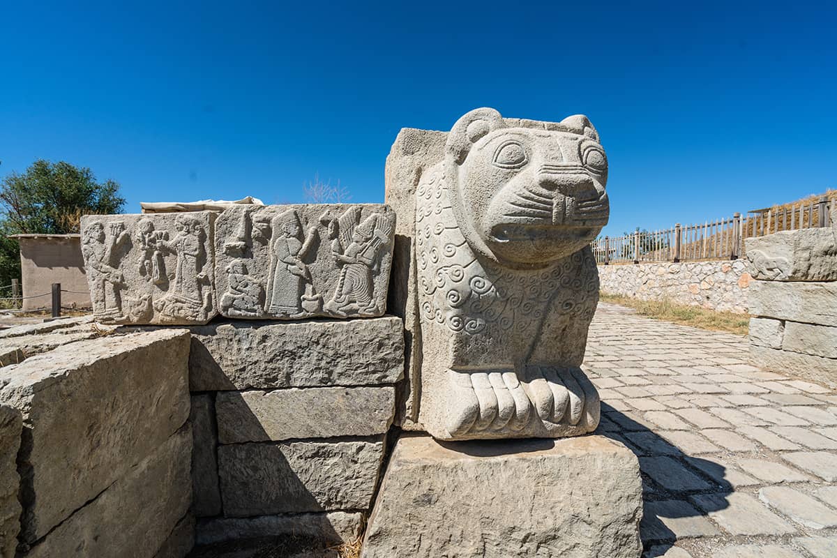 Once a Roman village and a Byzantine necropolis (cemetery), the site gets its name from the two busts of lions unearthed and today, standing at the site’s entrance. Excavations at the site started in 1931, and, in addition to the two lions, a courtyard decorated with low reliefs, a statue of the Hittite King Tarhunza, and a late Hittite palace have been unearthed. The walls of the palace with original white plasters and wall paintings are unique in their subject and style.